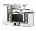 Недорогая стенка в гостиную Инстайл выполнена в сочетании белого фасада и светлого оттенка серого с фактурой бетона. Гостиная со стеклянными полками и двумя платяными шкафами сочетает все самое необходимое для удобного хранения.