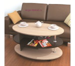 Овальный журнальный стол на колесиках выпускается в классическом сочетании темного и светлого дерева. Недорогой журнальный столик с тремя уровнями и хромированными опорами.