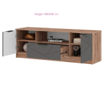 Недорогая напольная тумба для телевизора шириной 140 см с одним выдвижным ящиком и двумя дверцами. ТВ тумба с МДФ фасадами серого цвета и корпусом в теплом оттенке дерева. Выдвижной ящик с шариковыми направляющими, над ящиком открытая полка. За створками тумбы полки. Тумба для ТВ Орегон сочетается с другой мебелью для гостиной и спальни и может быть куплена в составе комплекта.