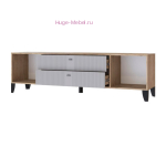 Современная ТВ тумба шириной 180 см с двумя выдвижными ящиками. ТВ тумба с матовыми фасадами МДФ серого цвета, корпус под дерево, дуб крафт серый. За двумя распашными дверцами тумбы пространство для хранения без полок.