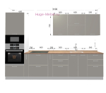 Недорогая модульная кухня длиной 3.1 метра с матовыми фасадами серого цвета. Кухонный гарнитур включает в себя пенал для встраиваемой техники и две бутылочницы с выдвижными металлическими корзинами. Кухонный гарнитур может быть изменен в соответствии с размерами вашей кухни.