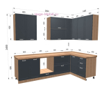 - В стоимость угловой кухни входят шкафы верхние и нижние с фасадами МДФ, ручки, петли, ножки, цоколь в цвет корпуса. Столешницы, стеновые панели и мойка приобретаются дополнительно.