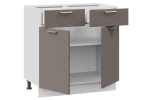 Добавляйте нижние шкафы подходящего размера. Например, нижние шкафы с ящиками ШН2Я800: ШН — шкаф нижний, 2Я — 2 ящика, 800 — ширина шкафа 800 мм или 80 см. Если вы планируете установить встроенную плиту, выбирайте модуль ШНД (шкаф нижний духовой). Торцевой нижний шкаф (ШНТ) позволит завершить угол.