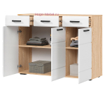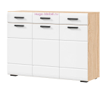 Большой комод шириной 120 см с тремя выдвижными ящиками и тремя створками. Комод с белым глянцевым фасадом и корпусом в цвете дуб сонома. Надежные фасады из МДФ с фрезеровкой в виде горизонтальных линий обтекаемой формы подчеркивают современный и лаконичный стиль. За распашными дверцами расположено по одной полке. Комод сочетается со всеми предметами коллекции мебели Либерти и подходит для прихожей, гостиной, спальни и детской в том же стиле.