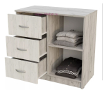 Недорогой комод из серии мебели для спальни Бася в современном сочетании фактурной отделки крафт белый и крафт серый. Комод Бася КМ-553 с тремя выдвижными ящиками и створкой с полкой внутри.