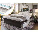 Недорогая двуспальная кровать с матрасом и выдвижными ящиками в популярном сочетании цветов темного и молочного дерева.