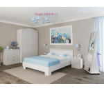 Эффектный спальный гарнитур белого цвета включает в себя 3-створчатый шкаф, полутороспальную кровать с мягкой спинкой, две прикроватные тумбы, комод и напольное зеркало. Все эти предметы можно купить отдельно или заменить, например, можно выбрать кровать и шкаф большего размера.