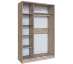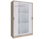 Недорогой шкаф купе шириной 140 см и высотой 220 см с тремя раздвижными дверьми и зеркалом. Внутри шкафа стационарная штанга и отсек с полками. Зеркала с фацетной обработкой. Компактный шкаф-купе выпускается фабрикой в нескольких цветовых решениях, в том числе в сочетании декоров под дерево дуб крафт серый и дуб крафт белый