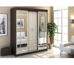 Недорогой шкаф-купе с зеркалами и тремя отделениями со штангой и полками. Шкаф-купе с выдвижными ящиками, центральные створки шкафа - распашные, боковые двери - раздвижные. Шкаф купе подходит для прихожей и спальни.