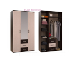 Узкий шкаф трехстворчатый для одежды с 3 ящиками и зеркальной дверью. Шкаф оснащен металлической штангой и полками для одежды. Недорогой шкаф для гостиной Белла сочетается с другой мебелью из этой же серии.