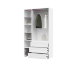 Недорогой трёхстворчатый шкаф Хелен ШК 06 с тремя выдвижными ящиками без зеркал. Шкаф шириной 120 см белого цвета. Внутри шкафа два отделения: двумя распашными створками неполной высоты, открывающиеся захватом снизу, хромированная штанга для одежды, внизу — три ящика полного выдвижения. Боковая секция шкафа с полками выполнена в виде глухого пенала и открывается нажатием с помощью толкателя.