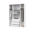 Белый 4-х створчатый шкаф с тремя выдвижными ящиками. Внутри шкафа 3 отсека: два отделения со штангой и отделение с полками. Выдвижные ящики на шариковых направляющих полного выдвижения. Шкаф входит в серию мебели Хелен и может быть дополнен пеналом, комодом или стеллажом в том же стиле.