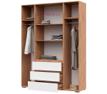 Современный недорогой и очень вместительный четырехстворчатый шкаф подходит для спальни и детской комнаты. Шкаф без ручек с матовыми белыми фасадами и корпусом под дерево золотистого цвета. Шкаф имеет продуманную конструкцию: центральная часть с полками и тремя выдвижными ящиками внизу и два отсека со штангами по бокам, над штангами антресольные полки. Распашной шкаф шириной 160 см и высотой 208 см в скандинавском стиле подходит для любого интерьера и сочетается с другой мебелью Хелен: комодами, кроватями, пеналами и шкафами.