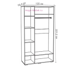 Трехстворчатый шкаф шириной 135 см с зеркальной створкой из серии модульной мебели Ливорно. Внутри шкафа отсек с 4 полками и отделение с металлической штангой для одежды на плечиках.
